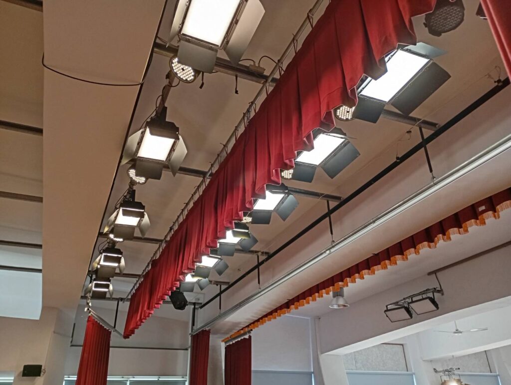 高安全性:由於涉及公眾場域和學生使用,所有設備必須符合國家標準,特別是布幕材質的防焰認證以及吊掛系統的結構安全。超載保護和緊急停止裝置是必備功能。